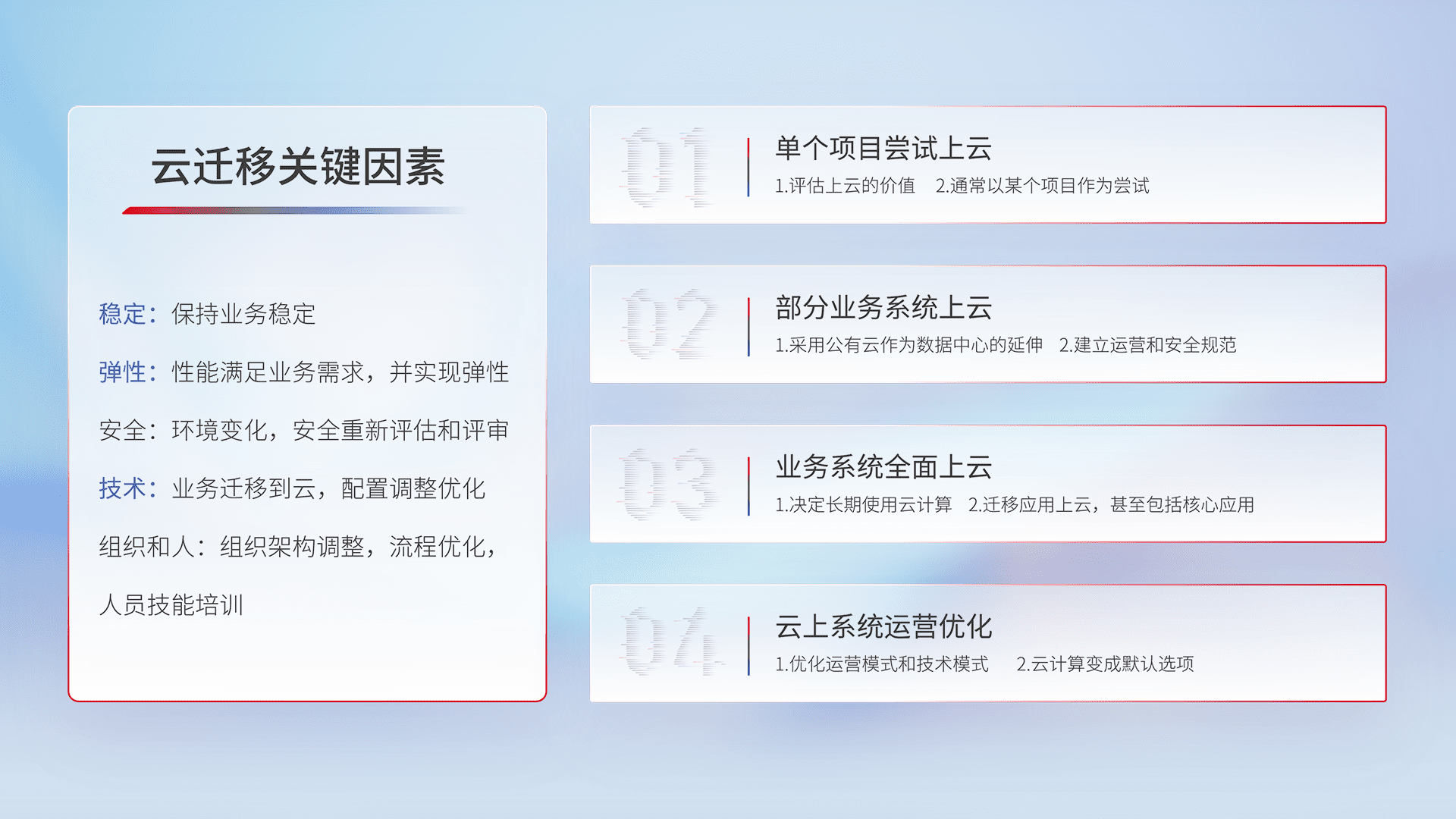 结合实际业务,,,,从规划设计、、云平台选型、、云原生改造、、、数据迁移、、、集成交付,,,迁移全过程为客户识别最佳上云路径,,,做好风险识别管理,,设计网络架构、、、身份权限、、、、安全审计合规、、操作审计、、、日志审计、、、监控告警策略、、、、多站点容灾设计等,,,对云上基础设施进行整体规划,,提升IT治理水平,,,以满足弹性、、、高可用、、、高性能的需求。。。