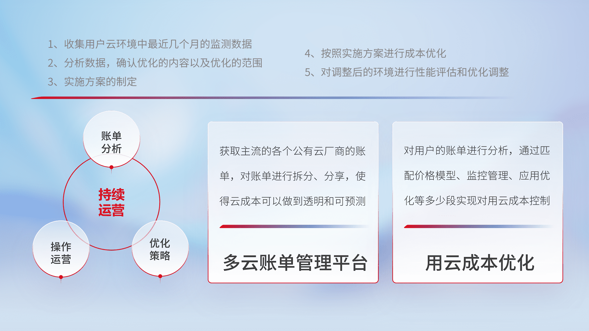 通过多云纳管,,,,以统一的资源数据模型把客户的云资源进行抽象和封装,,进而实现对多云资源的统一操作,,,保障云资源管理的可靠性、、、稳定性与可用性。。量身定制化运维内容,,配置、、、开发运维、、、、补丁管理、、备份、、监控、、认证和访问管理、、审计和日常巡检等,,,,保障在用云过程中的可靠度,,,,稳定度以及高可用率。。。。